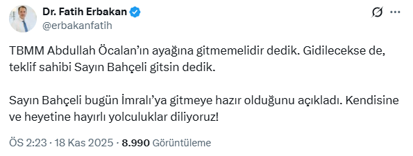 YRP lideri Erbakan, sosyal medya hesabından yaptığı paylaşımda, “TBMM Abdullah Öcalan’ın ayağına gitmemelidir dedik. Gidilecekse de, teklif sahibi Sayın Bahçeli gitsin dedik” ifadelerini kullanırken; “Sayın Bahçeli bugün İmralı’ya gitmeye hazır olduğunu açıkladı. Kendisine ve heyetine hayırlı yolculuklar diliyoruz!” dedi.